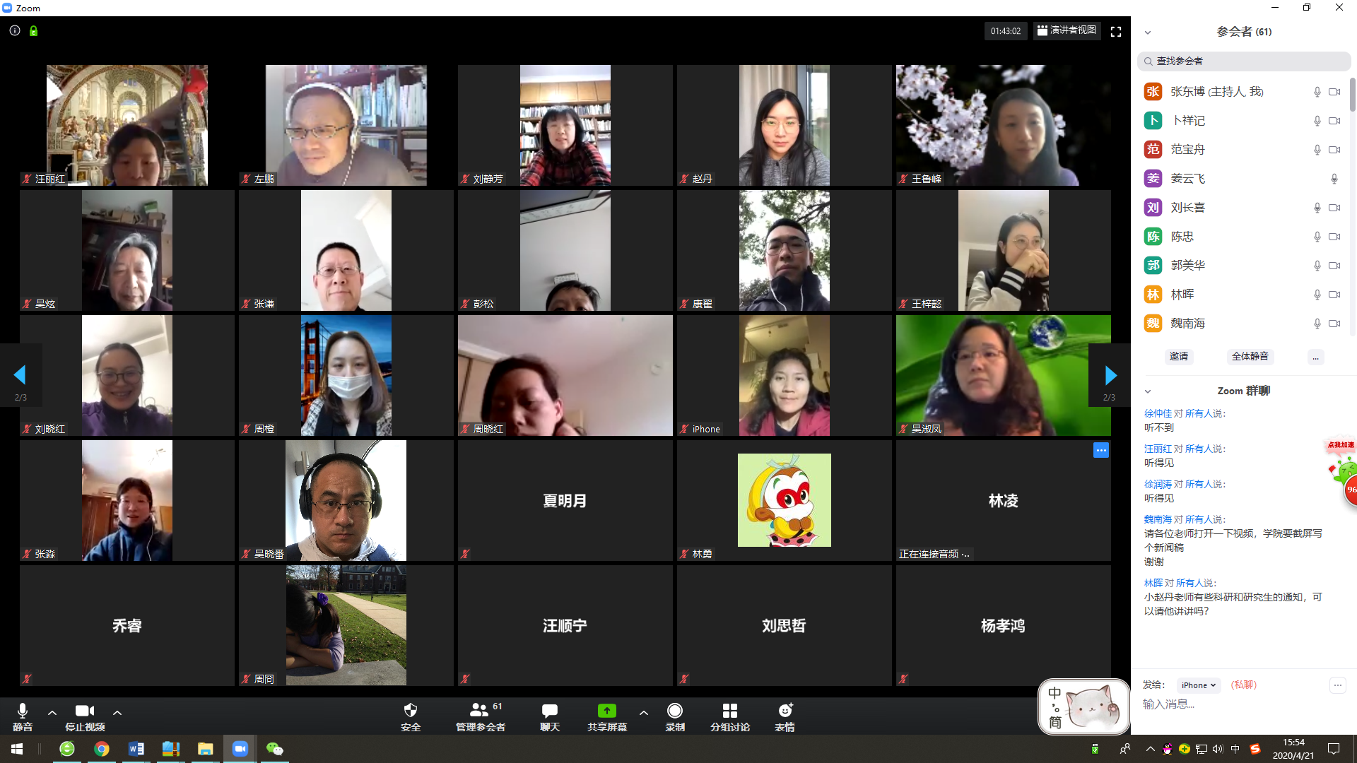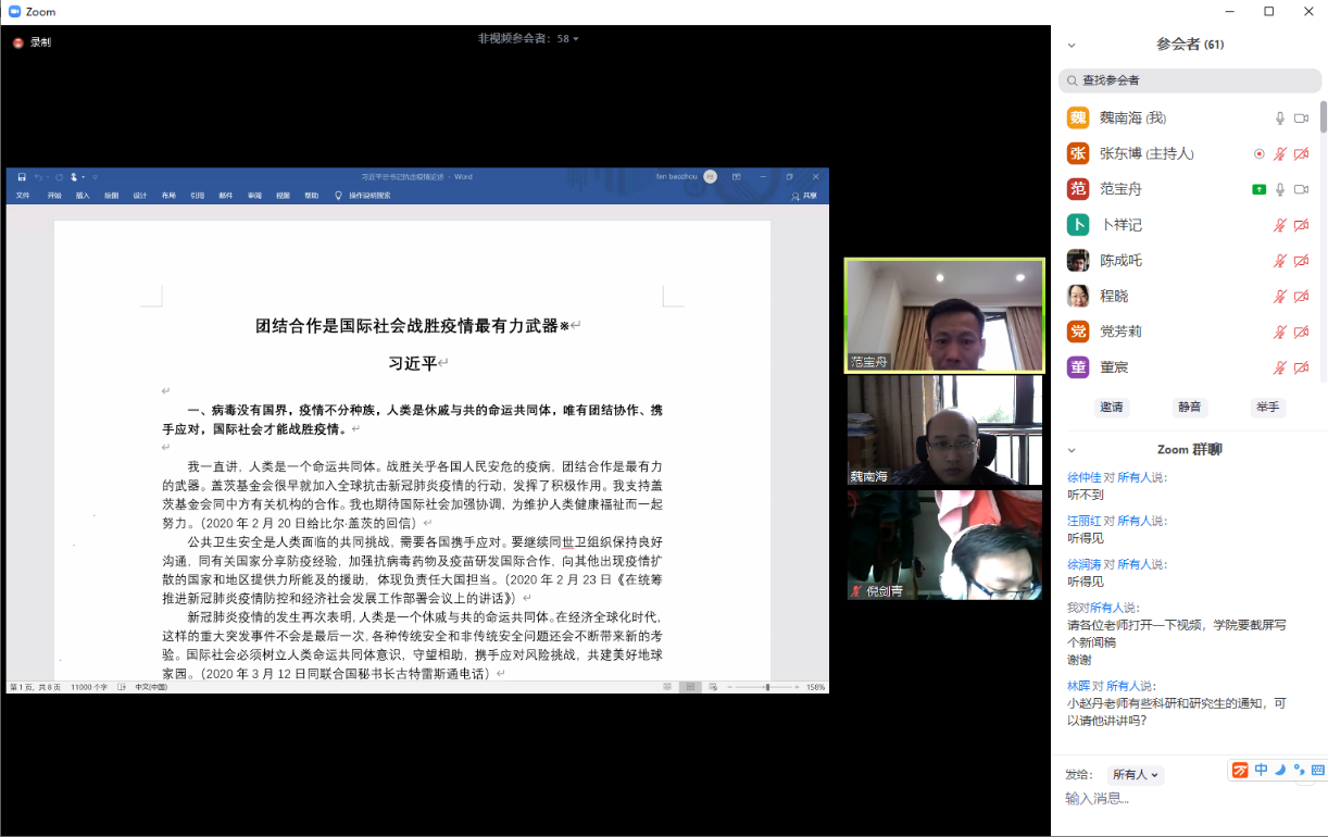 4月21日,人文学院利用Zoom网络会议平台,组织全体教职工开展了一次特殊的在线理论学习活动,集体学习了2020年第8期《求是》杂志发表的习近平总书记重要文章《团结合作是国际社会战胜疫情最有力武器》。本次集体学习活动由人文学院党委书记范宝舟教授主持。