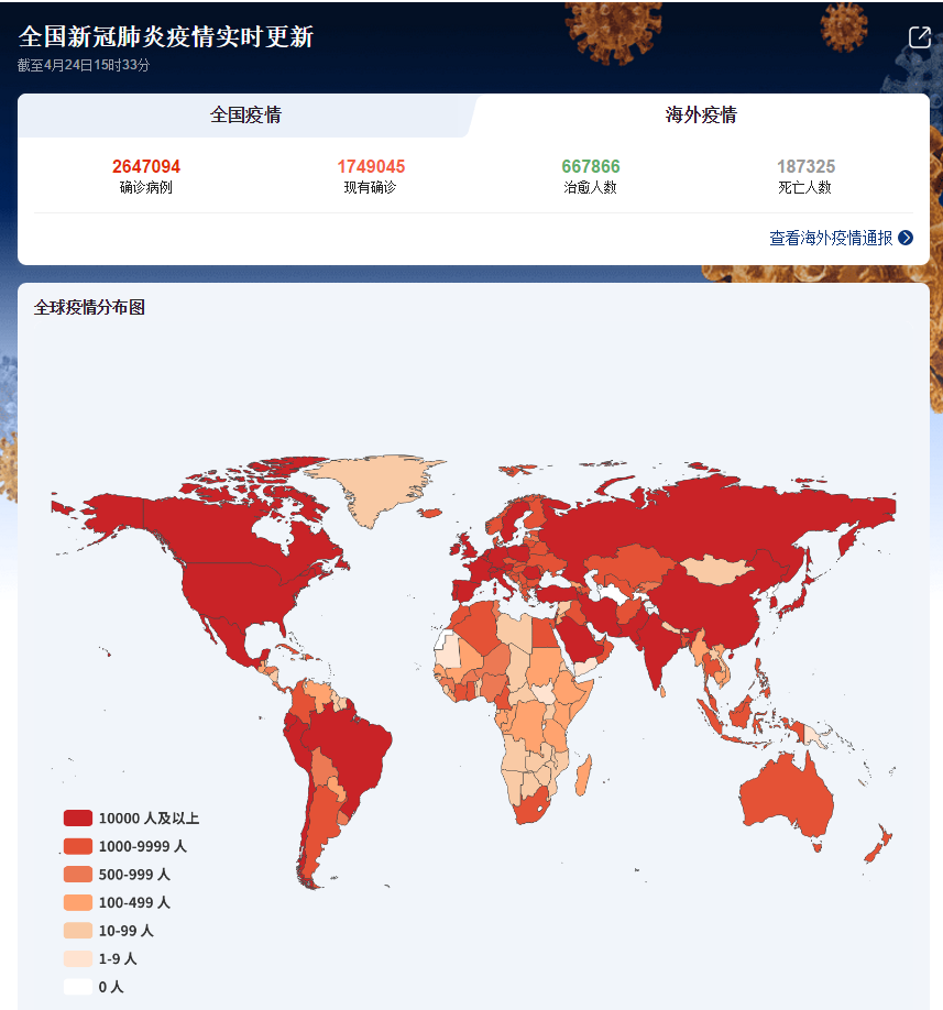 自2020年1月以来,2019冠状病毒病(COVID-19)疫情已经波及全球各地,给人类社会引发了前所未有的挑战,造成了严重的社会和经济后果。截止目前,全球已经确诊新冠肺炎病例逾273万,死亡人数超过19万。