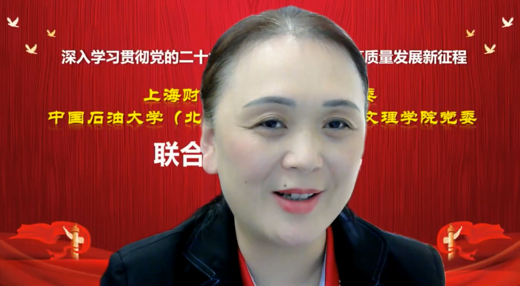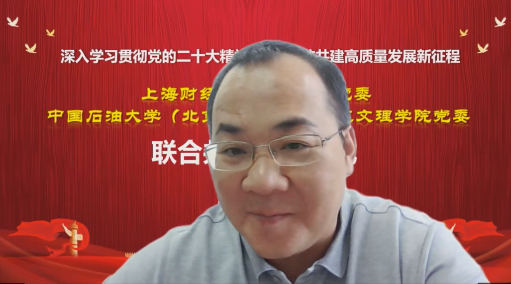 接下来,上海财经大学校长助理、党委常委、组织部部长刘庆生致辞。他表示,上海财经大学积极响应教育部统一部署要求,先后共选派11名教师赴克拉玛依校区参加援建工作,并凭借出色的工作赢得了双方的互信,奠定了双方合作的良好基础。随后,他介绍了上海财经大学坚持党建引领与事业发展深度融合的工作理念:强品牌、创特色,以融合式党建引领学校事业发展。他谈到,人文学院的党建工作也是积极落实学校党建工作一融双高的要求,在党建引领社会科学创新研究和大学生文化素质教育等方面成效显著。最后他希望双方充分发挥自己的学科专业特色,以党建联建引领师生学习贯彻国家重大战略,在服务一带一路建设、讲好中国能源故事、广泛开展媒体合作、政产教融合等方面,进一步推进两所学校之间的融合党建的共同发展。