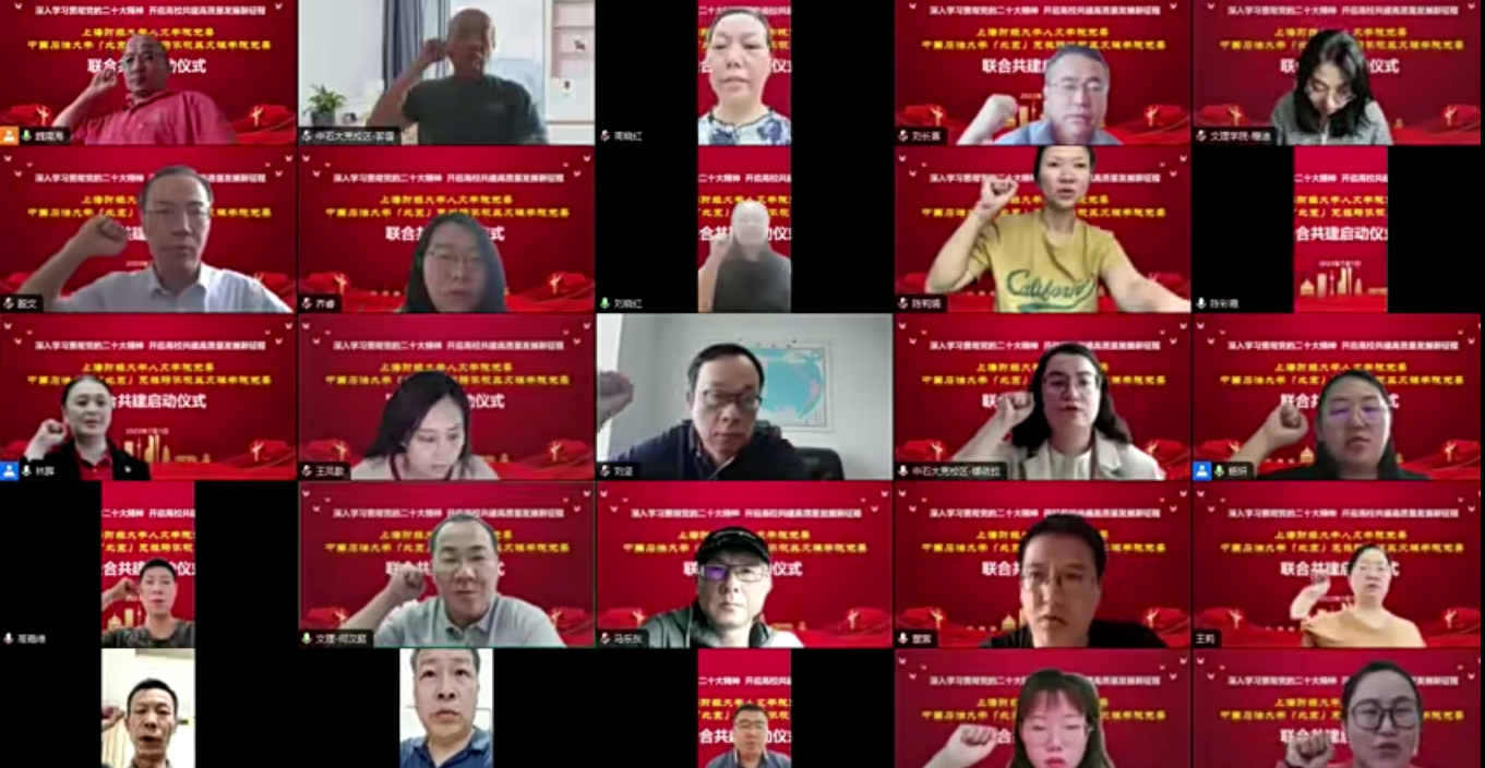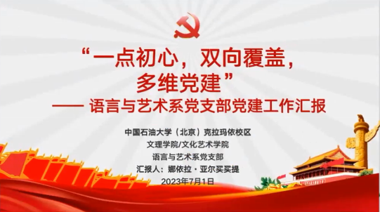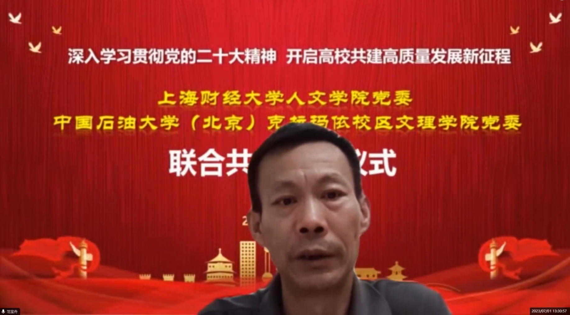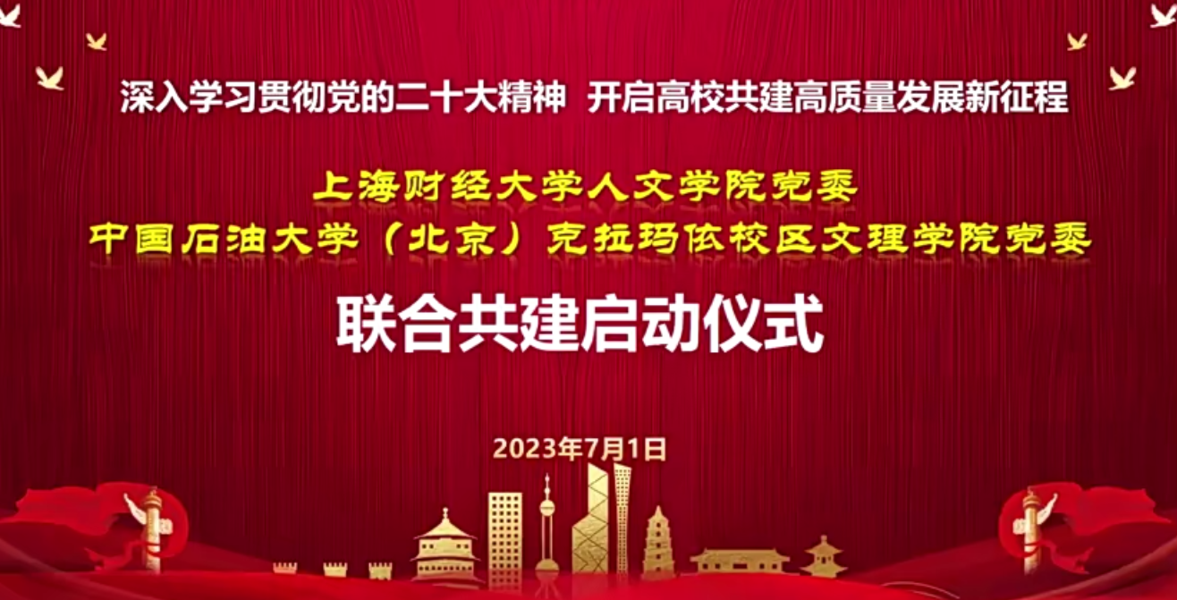 在中国共产党成立102周年之际,7月1日中午11点30分,上海财经大学人文学院党委与中国石油大学(北京)克拉玛依校区文理学院党委、新闻系教工党支部与语言与艺术系教工党支部联合共建仪式于线上举行。中国石油大学(北京)副校长、克拉玛依校区党委副书记刘坚,上海财经大学校长助理、党委常委、组织部部长刘庆生受邀参加线上会议并致辞。中国石油大学(北京)克拉玛依校区文理学院党委书记何汉挺、院长殷文、副院长杨妍,上海财经大学人文学院党委书记范宝舟,副院长林晖、刘长喜,党委副书记刘凯以及双方教师代表参加线上会议。会议分别由上海财经大学人文学院副院长、新闻系教工党支部书记林晖,中国石油大学(北京)克拉玛依校区文理学院副院长杨妍主持。