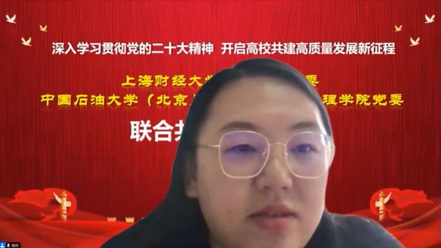 随后,中国石油大学(北京)副校长、克拉玛依校区党委副书记刘坚致辞。他首先代表中石大克拉玛依校区对上财多年来的援建工作表示衷心的感谢,向与会老师们详细介绍了校区成立的使命与愿景,以及“立足新疆、面向西部、服务全国、辐射中亚”的16字校训及办学定位等。他表示,2020年7月,习近平总书记给中国石油大学(北京)克拉玛依校区118名奔赴新疆基层建设的毕业生的回信,让学校全体师生深受鼓舞、倍感振奋。他谈到,感谢上财一直以来对于中石大克拉玛依校区的援建工作,尤其是上财在统计学、会计学等学科上的对口支援。今天两所高校尝试通过基层党委、党支部的合作共建,是双方高校进一步实现资源整合、融合党建的初步探索,期待以此为契机尽快实现双赢局面,通过深化党建联建共建,结合主题教育,进一步提升党组织的政治功能和组织功能。最后,他期待双方高校可以取长补短,中石大克拉玛依校区也早日可以为上财师生搭建重要的人才培育和实习实践平台。