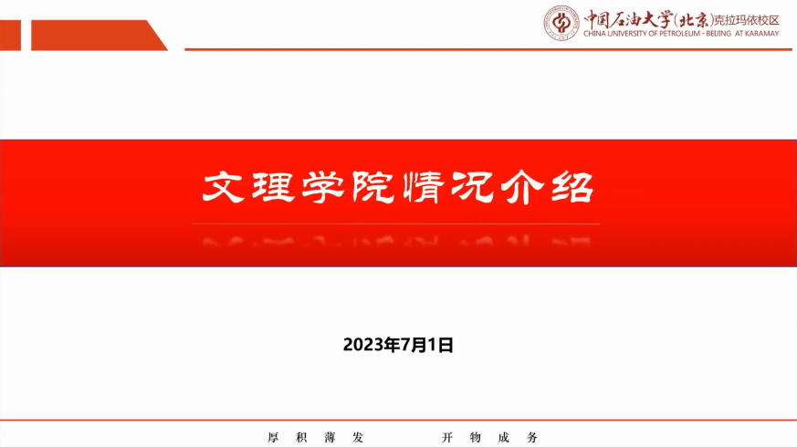 中国石油大学(北京)克拉玛依校区文理学院院长殷文,从基本情况、教学工作、师资队伍、人才培养、学生文化以及文化润疆6个方面介绍文理学院的建设情况,并充分肯定援疆教师通过“传帮带”,在本校青年教师教学水平提升上发挥了积极作用。最后,他期待两个学院通过党建联建进一步引领全方位发展。