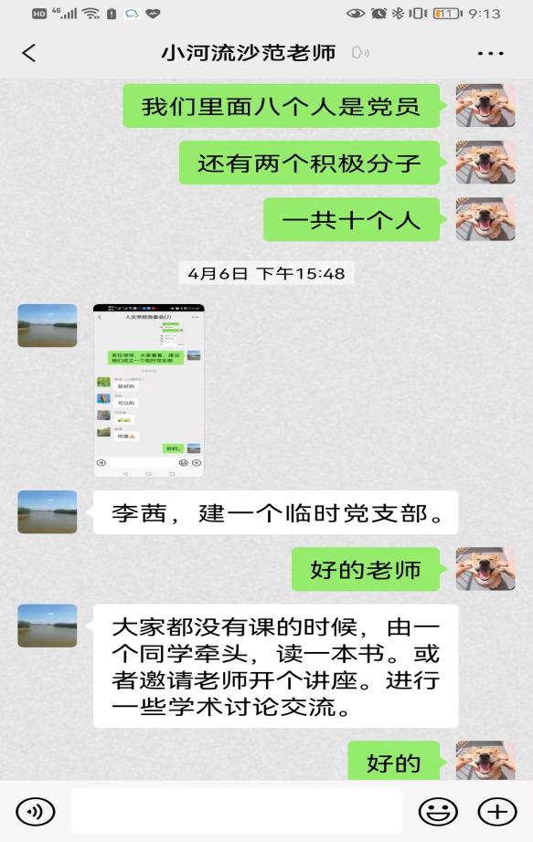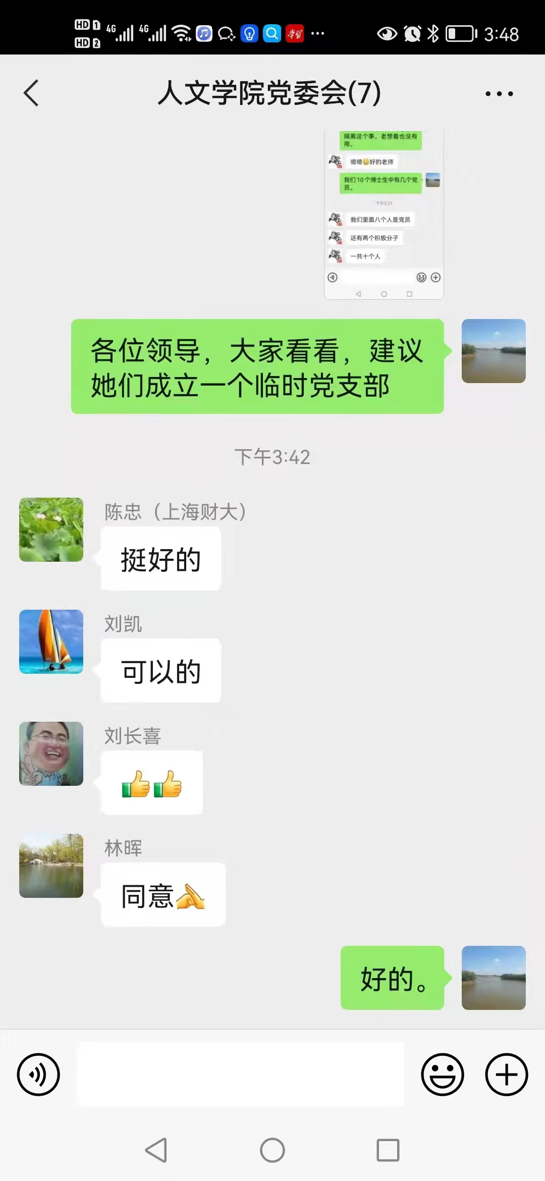 2022年4月5日,博士生支部八位党员,两位积极分子前往江苏无锡隔离。人文学院紧急成立了临时党支部——“人文学院博士生抗疫支部”,组织大家积极配合相关抗疫工作,互通有无,齐心抗疫。隔离期间,无锡市政府和酒店隔离工作人员悉心照料。学院范宝舟书记、刘凯副书记为隔离期间的同志们开展了悉心安抚工作,范书记用自身的工作和学习经历勉励大家,“生活中都会碰到大大小小的困难和问题,但这些都是宝贵的财富,会激励你更顽强地面对生活。希望大家在隔离期间,互帮互助,共担风雨,共克时艰!”隔离结束后,由人文学院博士生代表隔离在无锡的上海财经大学师生送上了温暖的感谢信与视频祝福,感谢他们的辛勤付出和无私奉献。