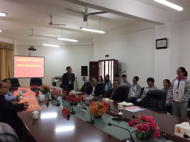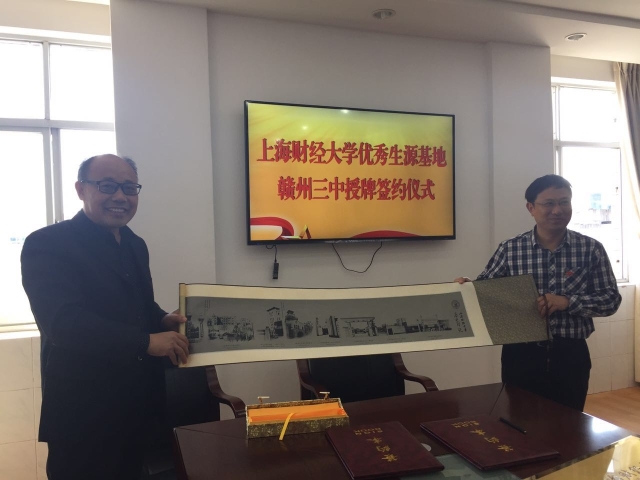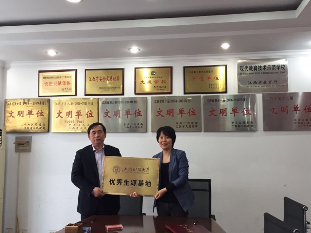 2017年4月26日至4月28日,上海财经大学人文学院党委书记杨乐、上海财经大学人文学院副院长李桂奎、上海财经大学本科招生办黄勇、上海财经大学人文学院本科教务刘曦等在江西校友会代表的陪同下,先后来到鹰潭市第一中学、贵溪市第一中学、江西师范大学附属中学、南昌市第二中学、赣州中学、赣州市第三中学,并与各校代表一起进行上海财经大学优秀生源基地签约挂牌仪式。加之四月初挂牌的新余一中、新余四中,至此我校在江西设立的优秀生源基地已达八所中学。
