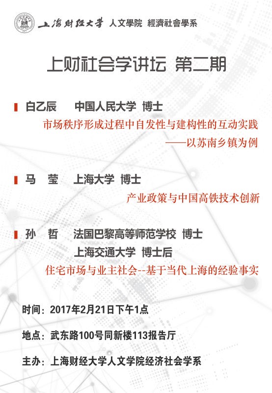 2017年2月21日下午1点,人文学学院经济社会学系在同新楼113室成功举办上财社会学讲坛第二讲。